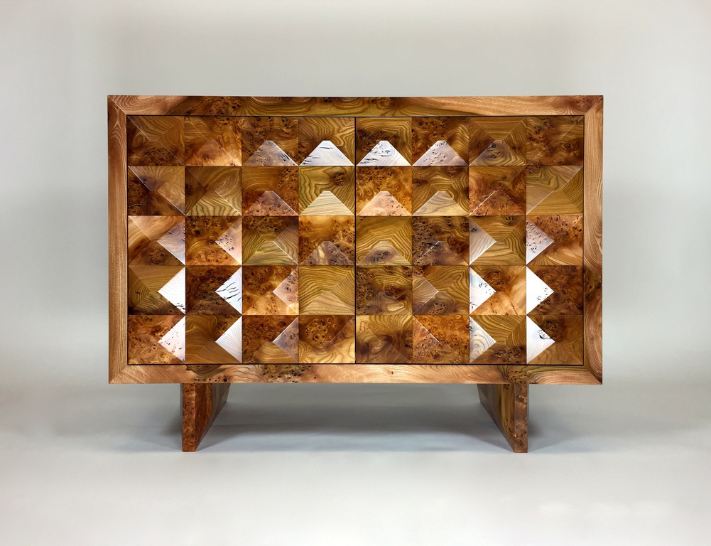 Faceted burr Elm cabinet that emphasises the woods natural grain.